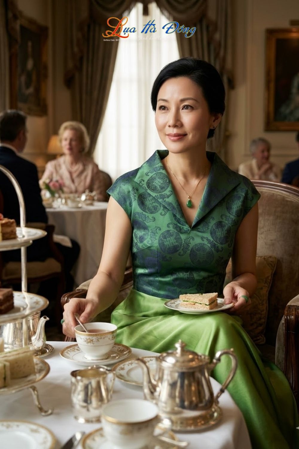 Xanh ngọc lục bảo có độ sâu thẳm đặc biệt. Khi được dệt trên nền lụa tơ tằm cao cấp, độ bóng nhẹ của lụa kết hợp với sắc xanh ngọc sẽ tạo ra hiệu ứng hắt sáng tự nhiên, giúp làn da của phụ nữ châu Á (đặc biệt là làn da có sắc tố vàng ấm) trở nên trắng sáng và rạng rỡ hơn. Nó làm mờ đi những dấu hiệu mệt mỏi hay làn da kém đều màu – một vấn đề phổ biến ở độ tuổi ngũ tuần.