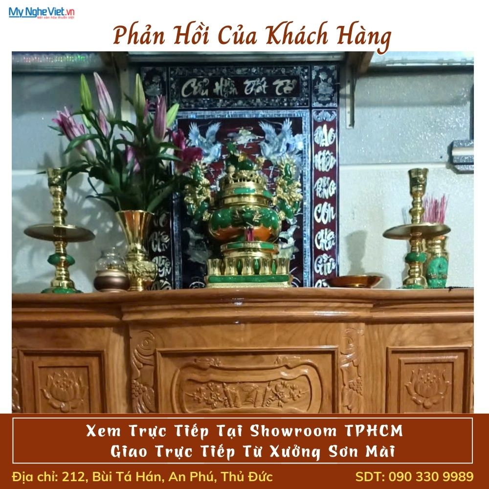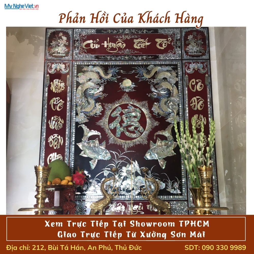 Lưu ý rằng, thương hiệu Mỹ Nghệ Việt – một trong những đơn vị chế tác đồ thờ thủ công mỹ nghệ uy tín. Hoàn toàn có thể tiếp nhận và đặt hàng theo quy cách khách hàng mong muốn. Tùy thuộc vào diện tích thực tế của phòng thờ, các nghệ nhân sẽ tư vấn và điều chỉnh kích thước, chiều dài sao cho vừa với không gian.Do đòi hỏi kỹ thuật sơn mài nhiều lớp, sấy khô tự nhiên và cẩn xà cừ thủ công tỉ mỉ.Thời gian hoàn thiện cho các đơn hàng thiết kế riêng thường dao động trong khoảng từ 45 đến 90 ngày.Sự chờ đợi này là hoàn toàn xứng đáng để gia đình bạn sở hữu một kiệt tác tâm linh độc bản, trường tồn với thời gian.