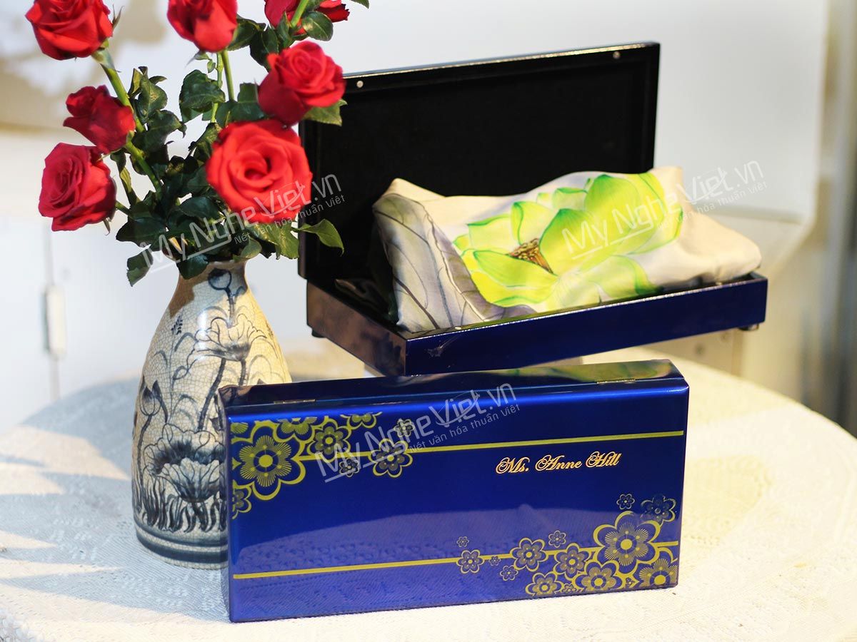 Tại Mỹ Nghệ Việt, chúng tôi có khăn lụa vuông tơ tằm với họa tiết khăn lụa vuông truyền thống như hoa sen hay chim lạc, phù hợp cho phong cách chuyên nghiệp.