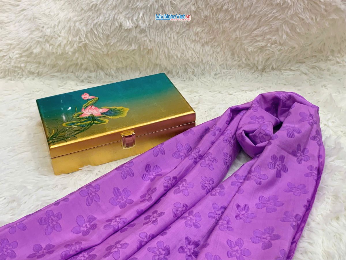 Sự kết hợp giữa nghệ thuật truyền thống Việt Nam và chất liệu cao cấp tạo nên món quà đặc biệt. Hộp sơn mài thủ công tinh xảo dùng để đựng những chiếc khăn lụa tơ tằm cao cấp mềm mại, nhẹ nhàng. Đây là món quà không chỉ đẹp mà còn tiện dụng, thể hiện sự chăm chút tỉ mỉ từ người tặng. Nó mang ý nghĩa về sự quý phái, trường tồn và sự kết nối giữa truyền thống và hiện đại.