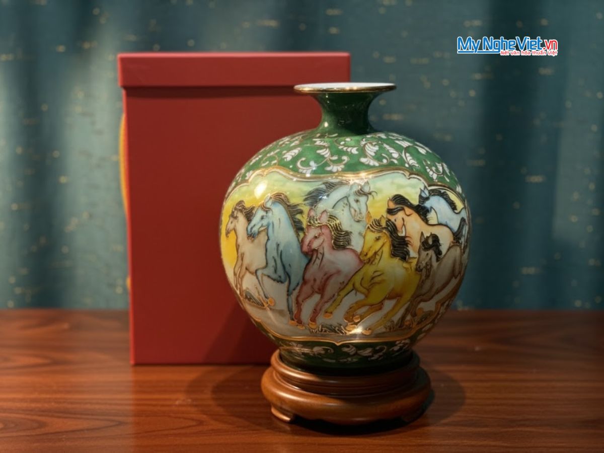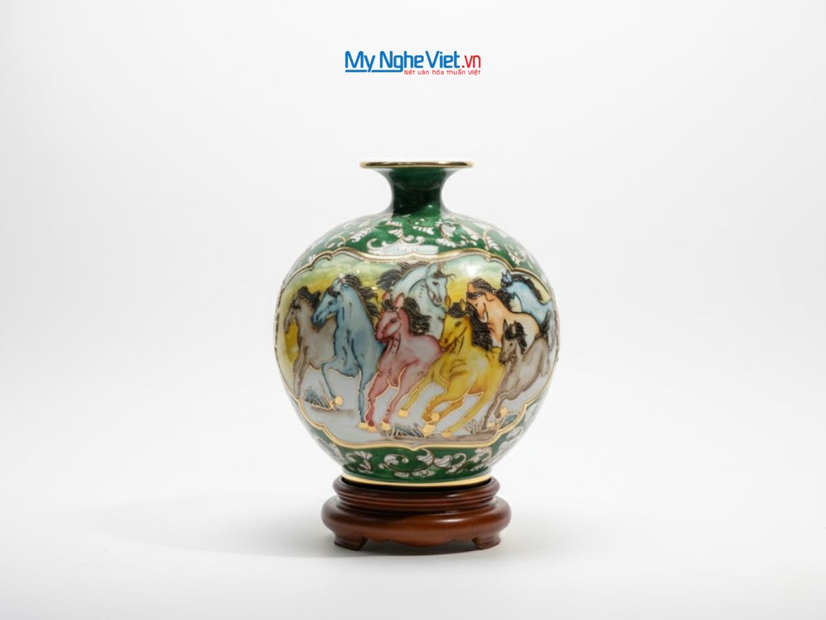 Chiếc Bình thu tài hút lộc mã đáo thành công gốm Bát Tràng bổ khung vẽ nhị cảnh đắp nổi là một tuyệt tác nghệ thuật. Kỹ thuật đắp nổi và bổ khung cho phép nghệ nhân thể hiện trọn vẹn sự sống động của hình ảnh “Mã Đáo Thành Công” (tám con ngựa dũng mãnh báo tin thắng lợi), một biểu tượng mạnh mẽ của thành công, tốc độ và sự phát triển vượt bậc trong kinh doanh. Chiếc Bình thu tài này còn được thiết kế với hình dáng miệng loe, cổ thon, bụng phình đặc trưng, tượng trưng cho việc “thu nạp vượng khí, giữ gìn tài lộc”.