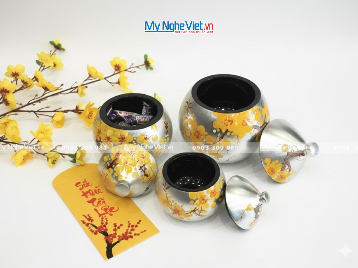 Bộ sản phẩm bao gồm: 01 Bộ ba hũ mận vẽ hoa mai vàng