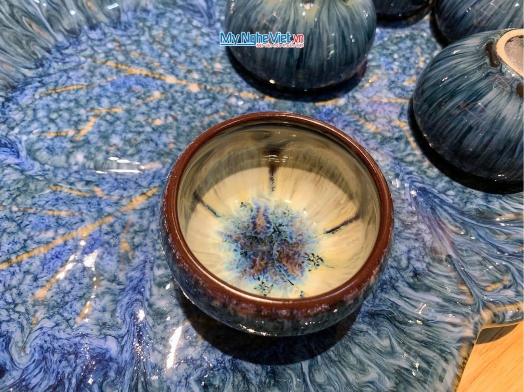 • Lòng chén họa tiết hoa xanh tinh xảo, tạo điểm nhấn nghệ thuật độc đáo khi thưởng thức trà.