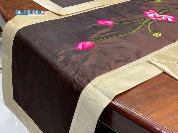 Bộ khăn trải bàn ăn họa tiết hoa sen là sự kết hợp hài hòa giữa chất liệu hiện đại và họa tiết mang đậm hồn Việt.
