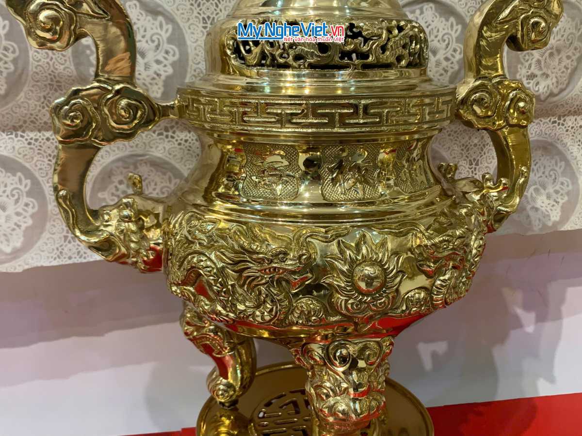 - Chiêu Tài Hút Lộc: Biểu tượng “Song Long Chầu Nguyệt” đại diện cho sự cân bằng Âm – Dương, mang lại sự thái bình, thịnh vượng. Hình tượng Nghê trên nắp đỉnh giúp trấn trạch, ngăn chặn tà khí xâm nhập.