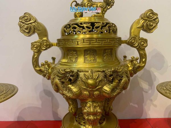 - Chiêu Tài Hút Lộc: Biểu tượng “Song Long Chầu Nguyệt” đại diện cho sự cân bằng Âm – Dương, mang lại sự thái bình, thịnh vượng. Hình tượng Nghê trên nắp đỉnh giúp trấn trạch, ngăn chặn tà khí xâm nhập.