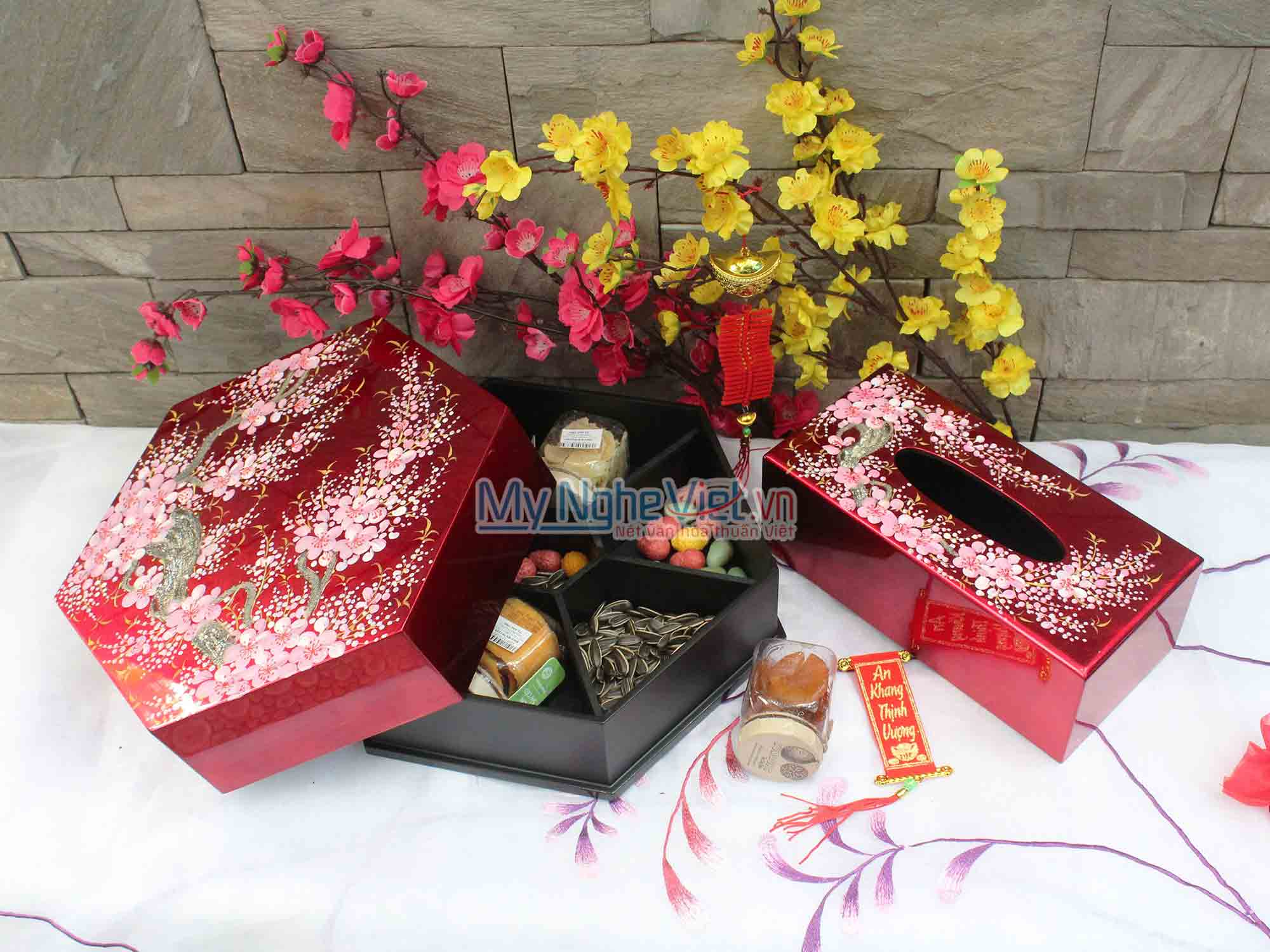 - Để bộ quà tặng tết sơn mài làm cho bàn tết thêm không khí xuân sang, họa tiết hoa, đậm nét tết, tô điểm ngôi nhà thêm xinh xắn