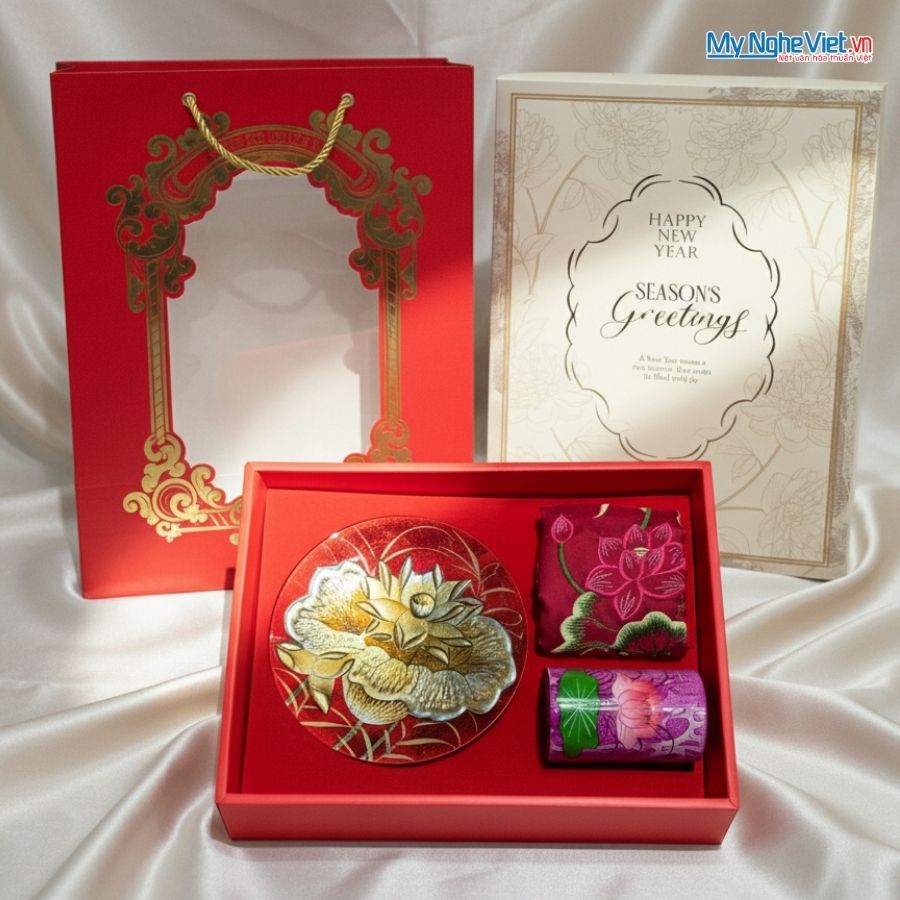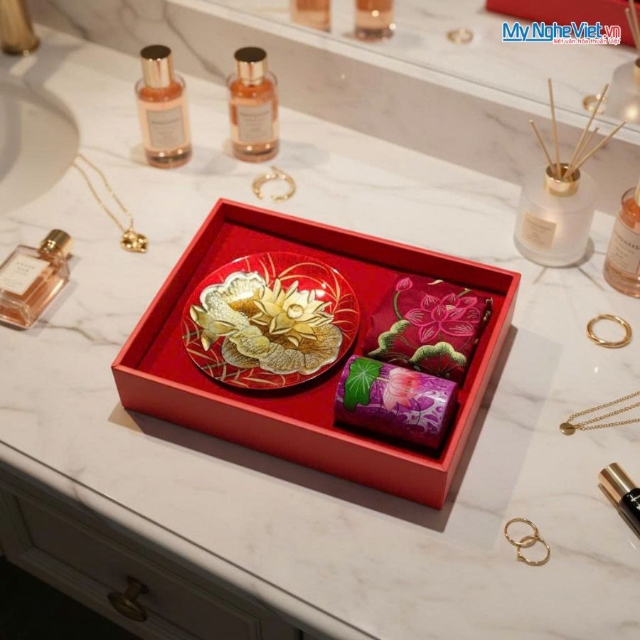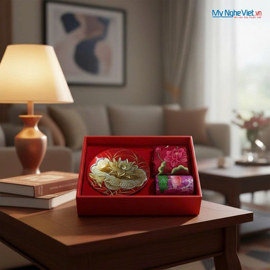 Hoa sen – biểu tượng của sự thuần khiết, thanh cao và sức sống mãnh liệt. Bộ quà tặng “Sắc Sen Duyên Dáng” không chỉ là những vật phẩm thủ công tinh xảo, mà còn là lời chúc cho một năm mới an khang, thịnh vượng.