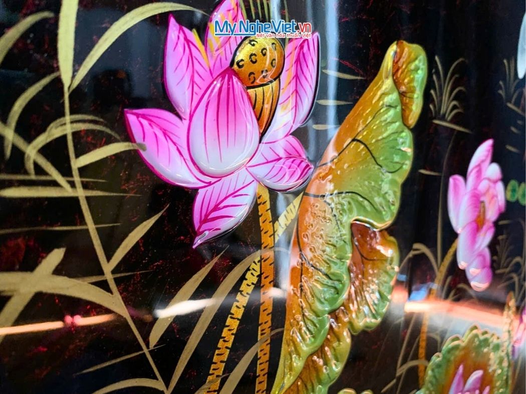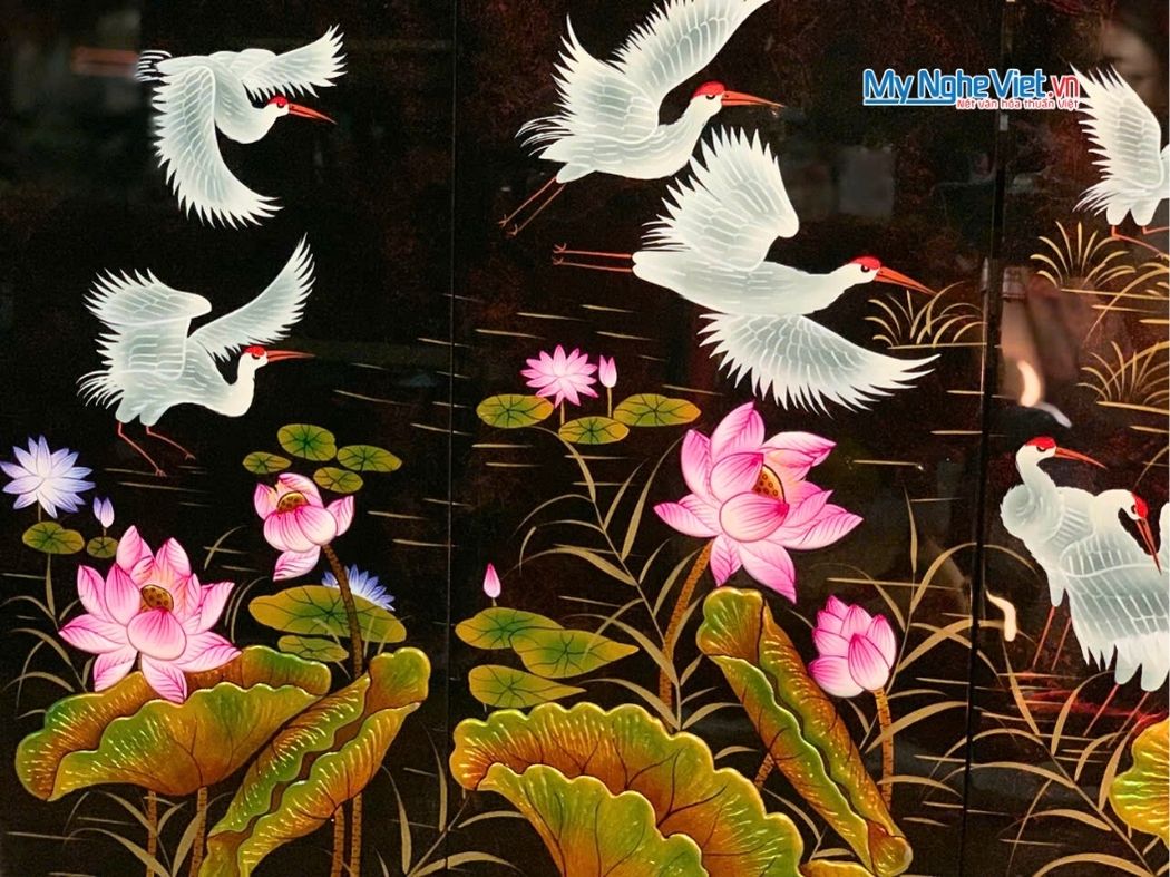 Sản phẩm được chế tác bởi các nghệ nhân giàu kinh nghiệm, sử dụng kỹ thuật Đắp Nổi độc đáo. Kỹ thuật này tạo nên sự sống động, có hồn cho từng cánh sen, từng nét lông cò, mang lại cảm giác 3D chân thực. Nguyên liệu sơn ta truyền thống giúp bức tranh sơn mài chất lượng cao có khả năng chống chịu cực tốt, giữ được màu sắc tươi mới, độ bóng sâu, và bền bỉ qua thời gian. Sự tỉ mỉ trong từng chi tiết đã khẳng định đẳng cấp của tranh sơn mài từ làng nghề truyền thống.