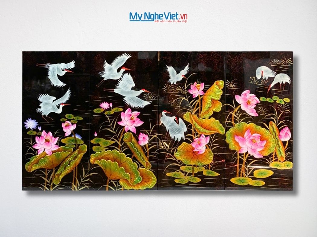 Sản phẩm được chế tác bởi các nghệ nhân giàu kinh nghiệm, sử dụng kỹ thuật Đắp Nổi độc đáo. Kỹ thuật này tạo nên sự sống động, có hồn cho từng cánh sen, từng nét lông cò, mang lại cảm giác 3D chân thực. Nguyên liệu sơn ta truyền thống giúp bức tranh sơn mài chất lượng cao có khả năng chống chịu cực tốt, giữ được màu sắc tươi mới, độ bóng sâu, và bền bỉ qua thời gian. Sự tỉ mỉ trong từng chi tiết đã khẳng định đẳng cấp của tranh sơn mài từ làng nghề truyền thống.