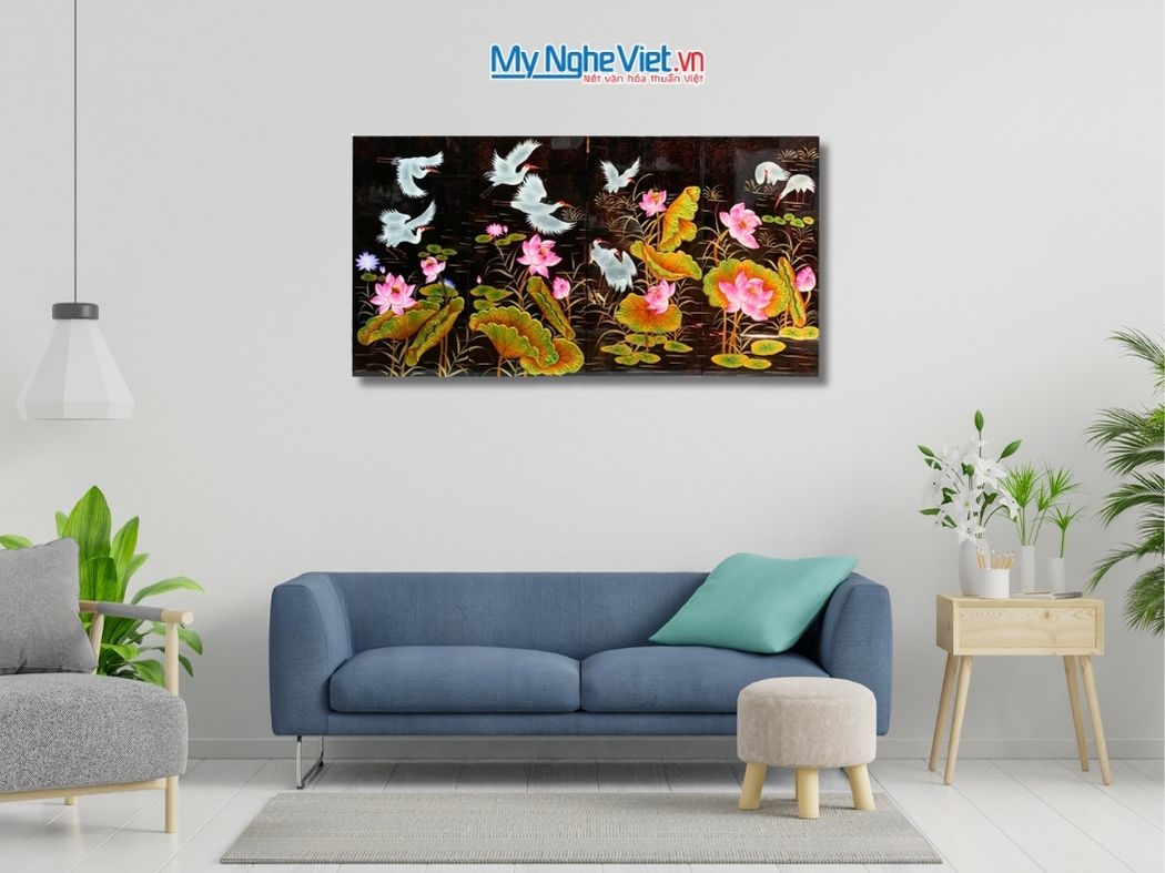 Treo tranh Sơn Mài Cò Sen trong nhà giúp tạo không khí thư thái, thanh tịnh và cầu mong những điều tốt lành.