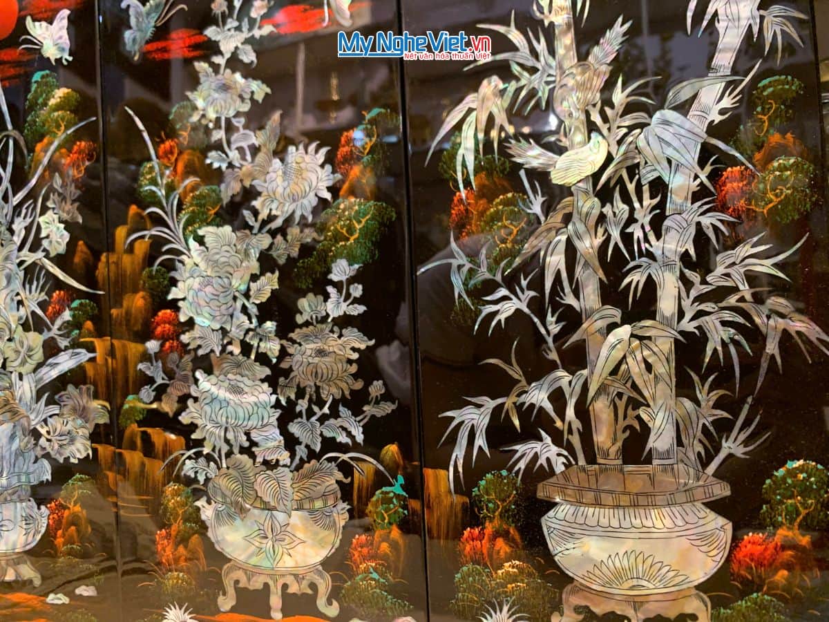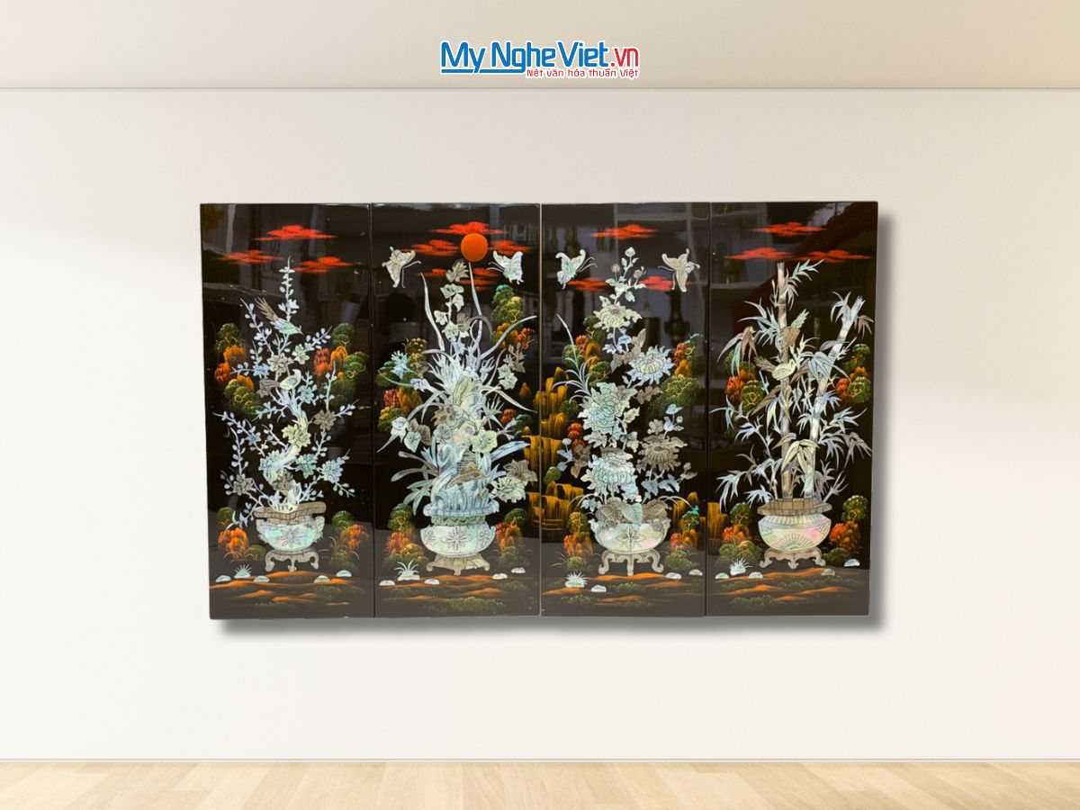 Mẫu tranh mai lan cúc trúc nền ấm- màu cánh dán không chỉ tô thêm cho ngôi nhà thêm sang trọng mà còn làm tăng may mắn cho gia chủ. Mẫu tranh được làm từ những vỏ ốc, vỏ trai biển cho tranh độ phản chiếu lấp lánh khi ánh sáng và ánh đèn chiếu vào ra 7 màu phản quang vô cùng đẹp mắt. Tranh đặc biệt được khảm láng- trơn với bề mặt tranh rất kì công của những nghệ nhân làng nghề.