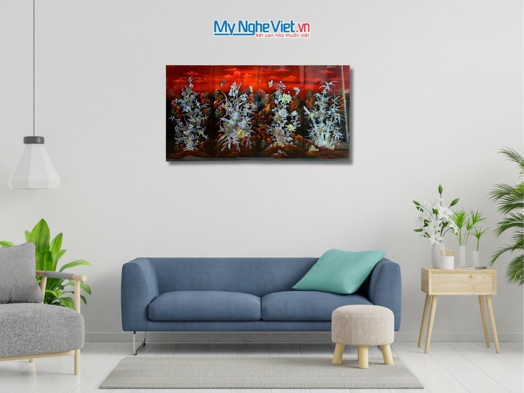 Điểm đặc biệt của sản phẩm là kỹ thuật Cẩn Ốc Nổi trên nền sơn mài màu ấm (Gốc nền Ấm). Từng mảnh vỏ trai, vỏ ốc được cắt gọt, mài dũa và khảm nổi thủ công, tạo ra hiệu ứng 3D lấp lánh và rực rỡ dưới ánh sáng. Chất liệu sơn ta truyền thống giúp bức tranh mai lan cúc trúc có độ bền tuyệt đối, không bị cong vênh, mối mọt, giữ được vẻ đẹp tinh tế, tỉ mỉ qua nhiều thập kỷ.