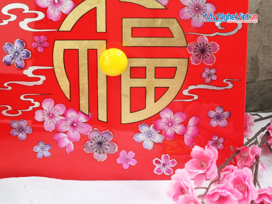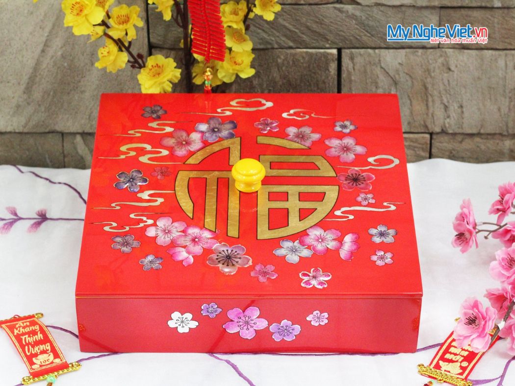 • Hộp Nền Đỏ cẩn ốc, họa tiết Hoa Đào, Chữ Phúc – quà Tết may mắn, sang trọng.