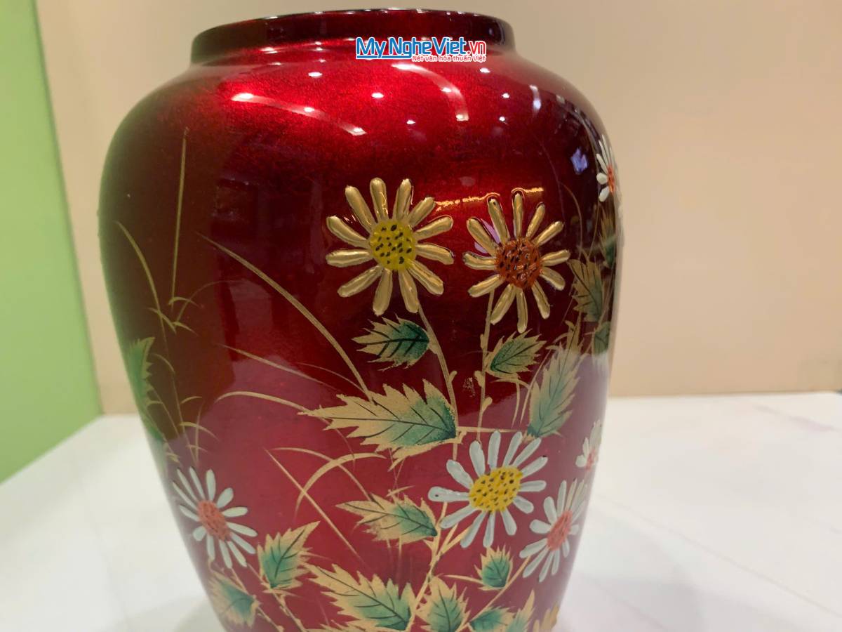 • Họa tiết hoa cúc đắp nổi tinh xảo, thể hiện vẻ đẹp thanh khiết và bền bỉ của người phụ nữ Việt Nam.
