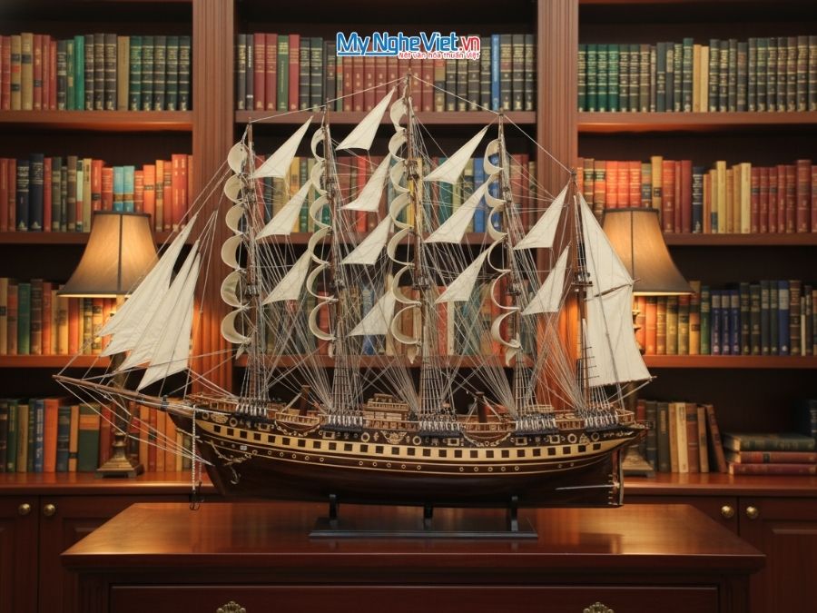• Thân tàu dài 2.5m bề thế, chế tác từ gỗ quý đen tuyền sang trọng, tạo điểm nhấn quyền uy cho không gian lớn.