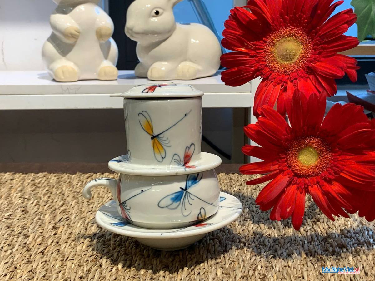 Điểm nhấn của chiếc phin này chính là họa tiết chuồn kim xanh đỏ được vẽ tay một cách sống động, tinh xảo. Mỗi nét vẽ đều thể hiện sự tỉ mỉ, khéo léo của người nghệ nhân, tạo nên một tác phẩm mang đậm hơi thở của thiên nhiên và văn hóa Việt Nam.