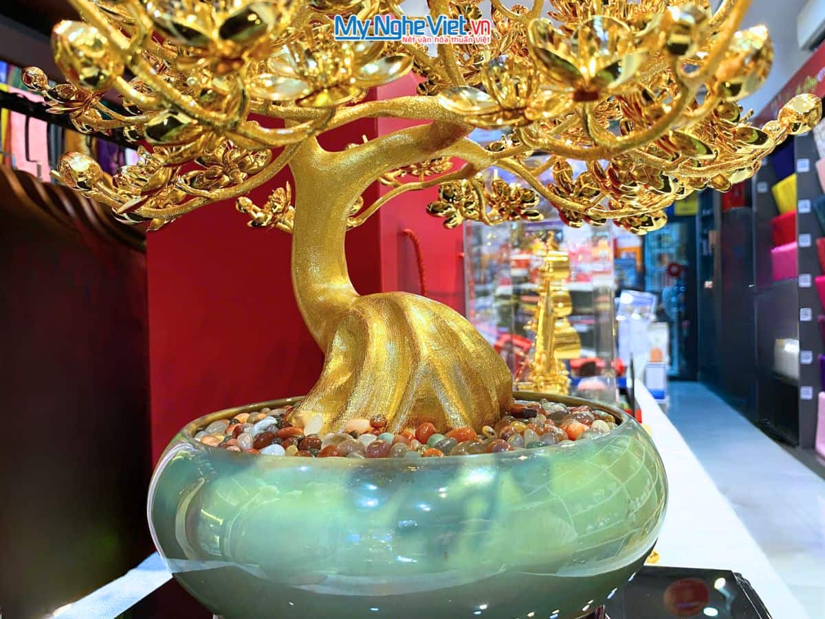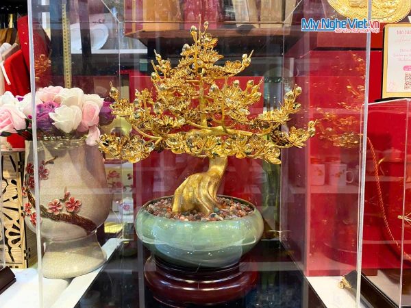 Sau khi chạm khắc, cây bonsai được mạ vàng 24K qua quá trình điện phân. Lớp vàng không chỉ làm tăng vẻ đẹp rực rỡ mà còn giúp bảo vệ sản phẩm khỏi tác động của môi trường, giữ được độ bền cao.