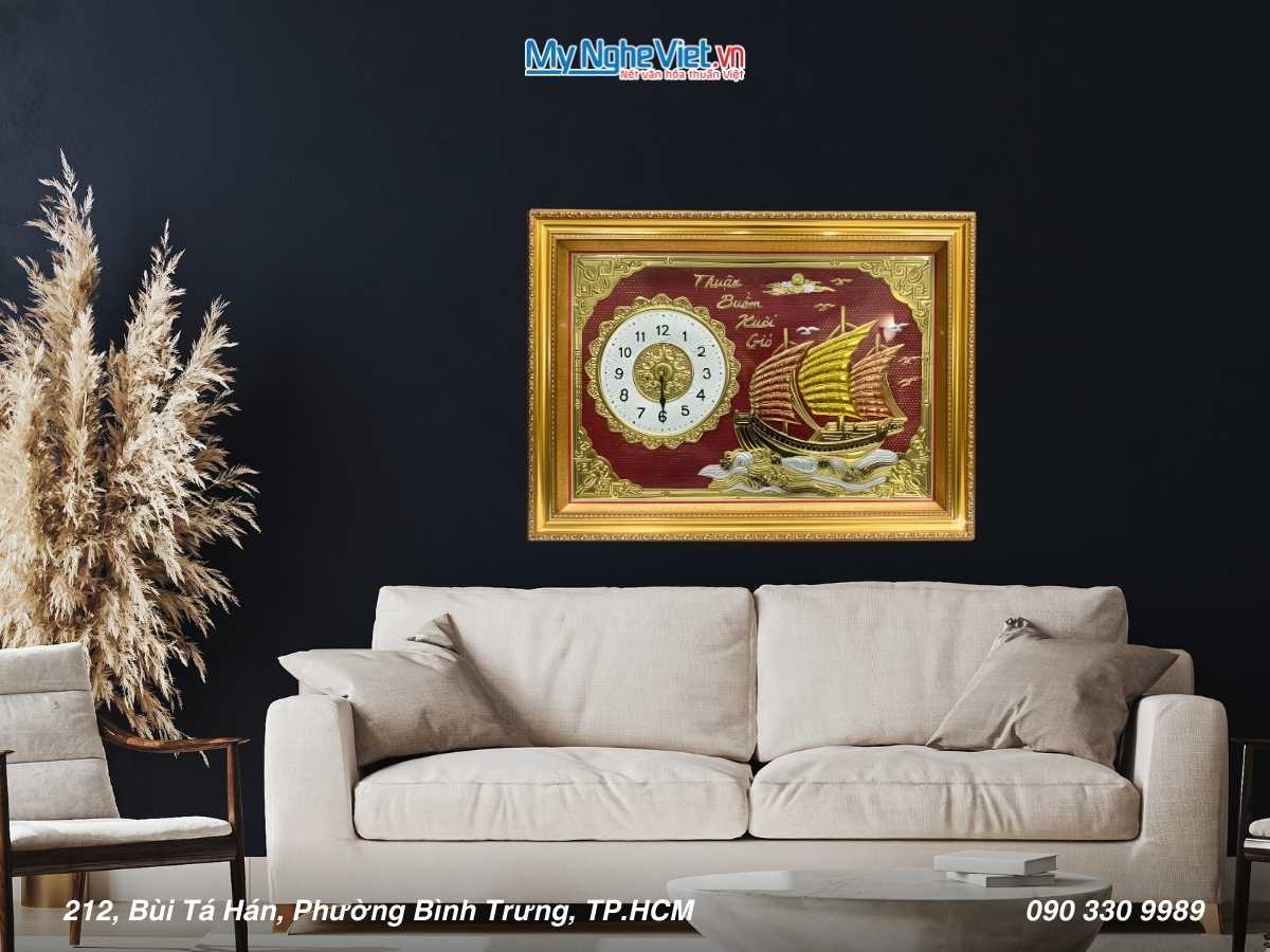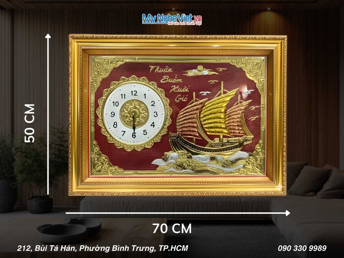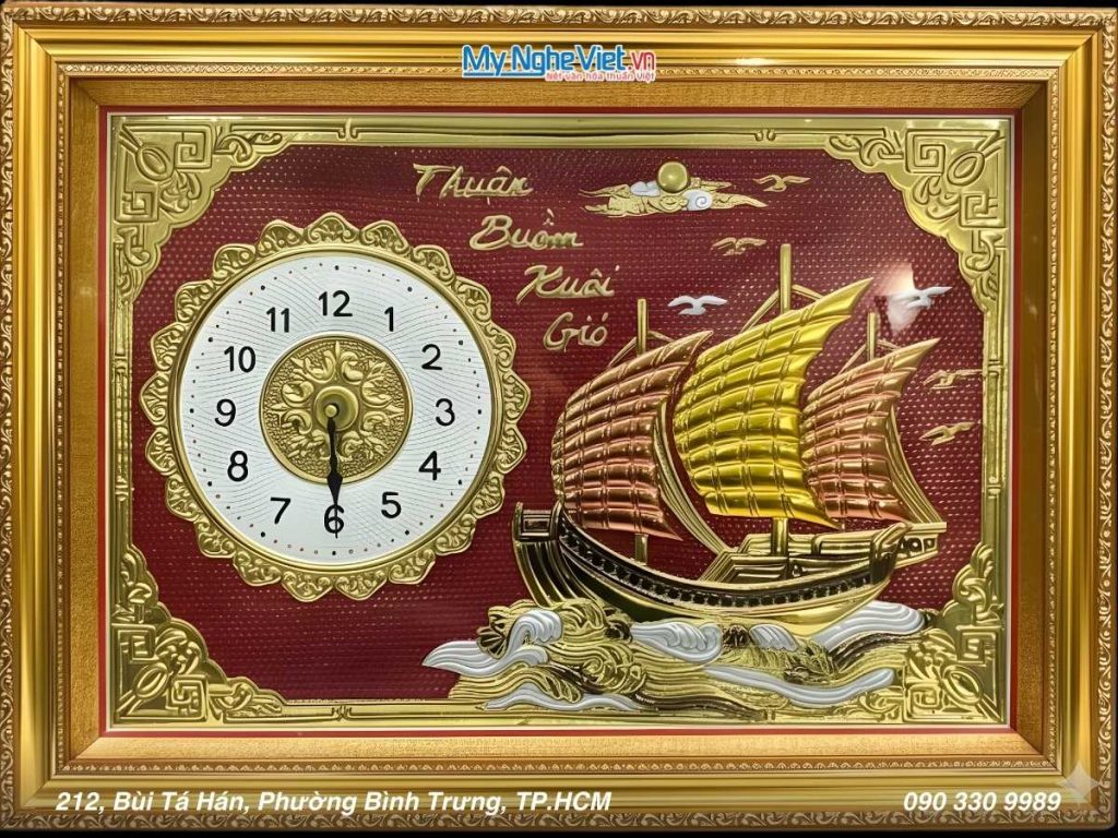 Tranh đồng – Đồng Hồ Thuận Buồm là một trong những tác phẩm nghệ thuật. Độc đáo và có ý nghĩa phong thủy sâu sắc trong văn hóa Việt Nam. Đây là loại tranh được chế tác từ đồng nguyên chất. Với hình ảnh con thuyền buồm căng gió, biểu tượng cho sự thuận lợi, hanh thông và phát triển trong công việc cũng như cuộc sống. Tranh đồng Thuận Buồm rất được ưa chuộng trong các dịp tân gia, khai trương, làm quà tặng đặc biệt. Bức tranh mang theo những lời chúc tốt đẹp và may mắn đến gia chủ.