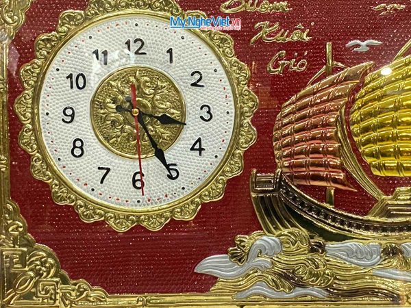 Tranh đồng – đồng hồ là một loại tranh nghệ thuật được chế tác tỉ mỉ bởi những nghệ nhân tài hoa qua các công đoạn chạm khắc tinh xảo. Tranh đồng Thuận Buồm với hình ảnh con thuyền buồm căng gió ra khơi. Mang ý nghĩa phong thủy vô cùng mạnh mẽ. Hình ảnh con thuyền tượng trưng cho sự ra khơi. Bắt đầu những hành trình mới với hy vọng và khát vọng thành công. Buồm căng gió biểu hiện cho sự thuận lợi, mọi việc diễn ra suôn sẻ và đạt được kết quả như mong muốn.