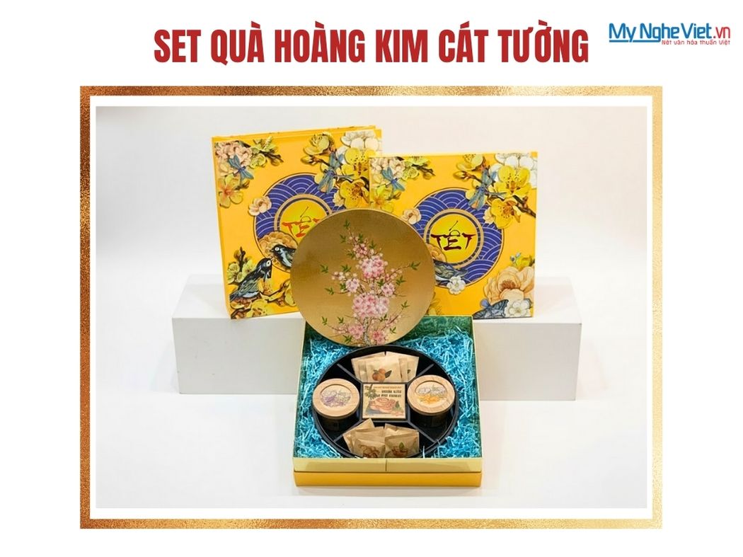 Sự kết hợp hoàn hảo giữa nghệ thuật sơn mài truyền thống và phong vị Tết hiện đại. Set quà nổi bật với sắc vàng hoàng kim rực rỡ, tượng trưng cho sự thịnh vượng và may mắn. Hộp quà được chế tác tỉ mỉ với họa tiết chim hỷ tước và hoa mai, mang thông điệp về một mùa xuân an vui, hỷ sự lâm môn.