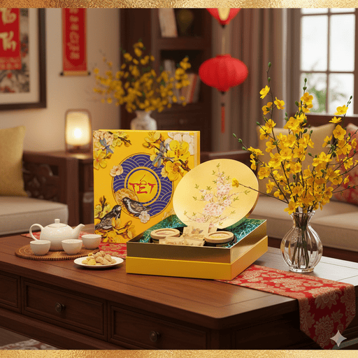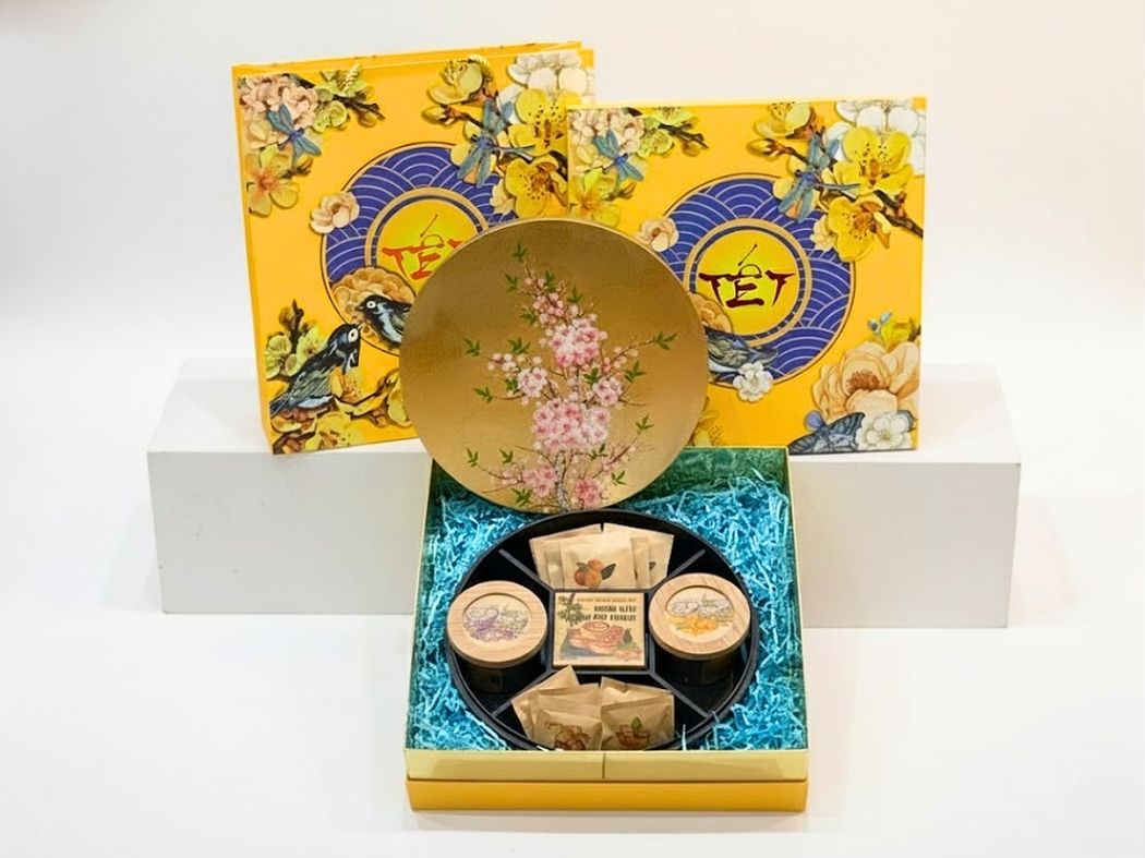 Bên trong hộp là sự tuyển chọn kỹ lưỡng của các loại bánh mứt thượng hạng, được đặt trang trọng trong các hũ sơn mài nhỏ nhắn, giữ trọn hương vị truyền thống bên cạnh chén trà thơm. Đây không chỉ là một món quà, mà là một tác phẩm nghệ thuật làm đẹp thêm không gian phòng khách trong những ngày đầu năm.