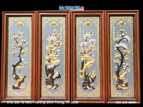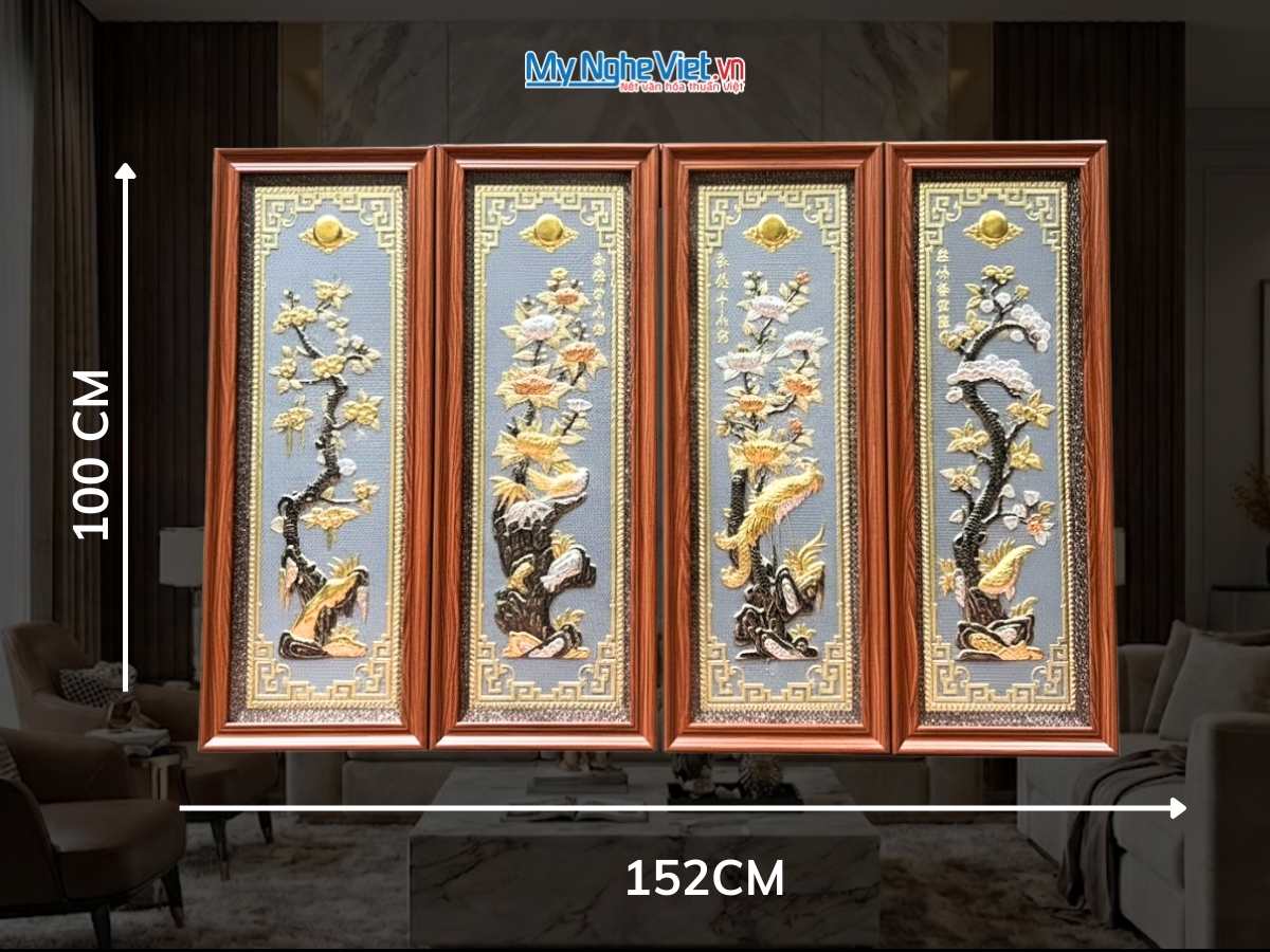 - Thiết kế đa dạng, phong phú: Tranh tứ quý tùng cúc trúc mai Đại Bái có nhiều kích thước, mẫu mã khác nhau, phù hợp với mọi không gian trưng bày.