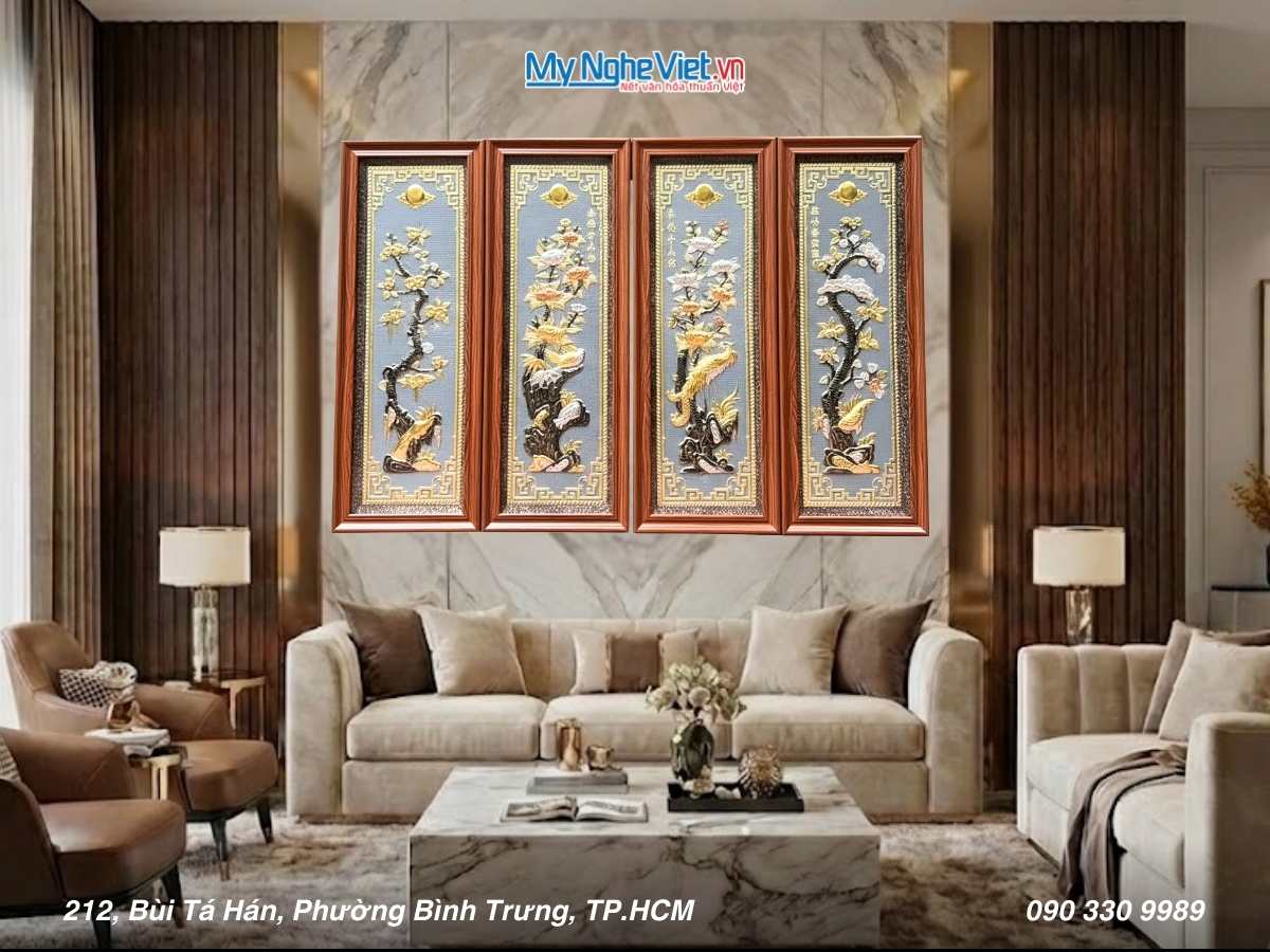 Tranh đồng Đại Bái từ lâu đã nổi tiếng với vẻ đẹp tinh xảo, sang trọng và ý nghĩa phong thủy sâu sắc. Trong số các chủ đề tranh đồng được ưa chuộng nhất, tranh tứ quý tùng cúc trúc mai luôn chiếm vị trí đặc biệt bởi giá trị nghệ thuật và ý nghĩa tượng trưng cao đẹp.