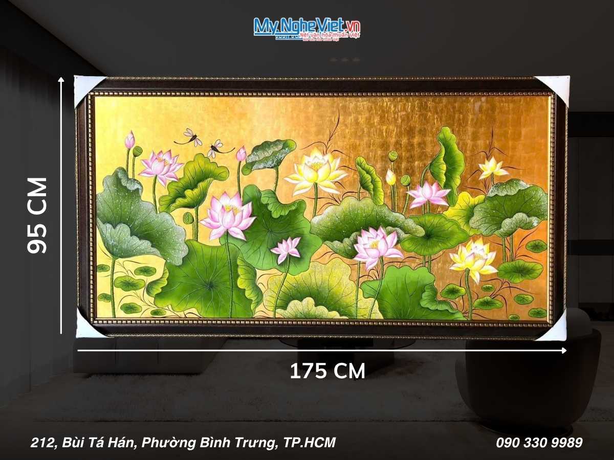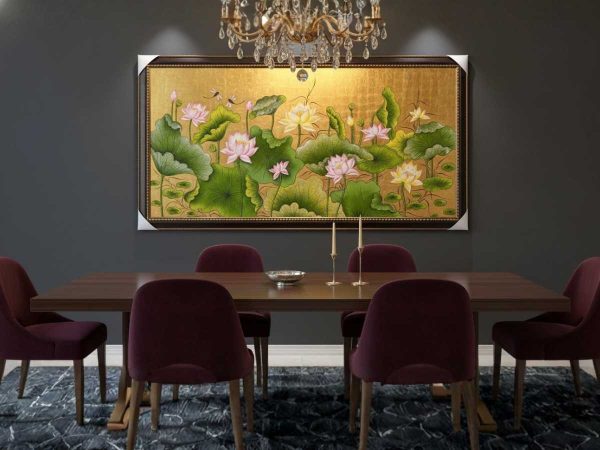 Đặc biệt, tranh sơn mài sen đắp nổi mang đến hình ảnh hoa sen – biểu tượng của sự thanh khiết, kiên cường và thịnh vượng trong văn hóa Việt. Kỹ thuật đắp nổi giúp cánh sen, lá sen hiện lên sống động, chân thực, tạo cảm giác như đang ngắm nhìn một đầm sen rực rỡ ngay trong không gian của bạn.