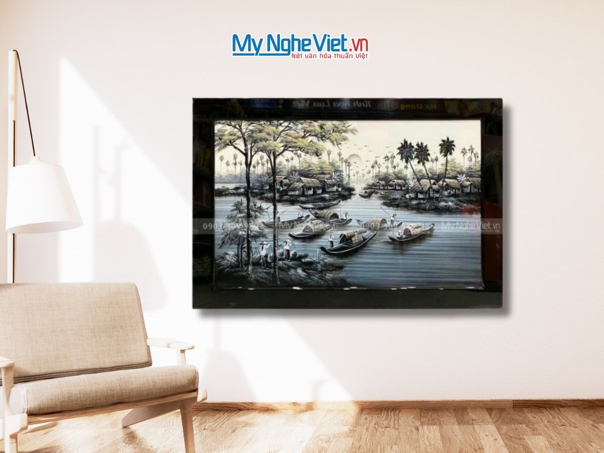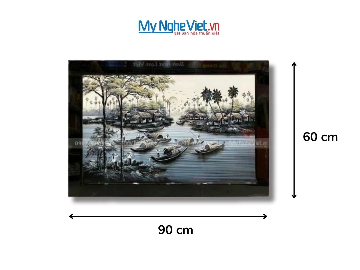 ✨ Tranh sơn mài phong cảnh sông nước nổi bật với tông màu dịu dàng, hình ảnh thuyền chài và cây cọ hài hòa, mang đến vẻ đẹp thôn quê đậm chất riêng.