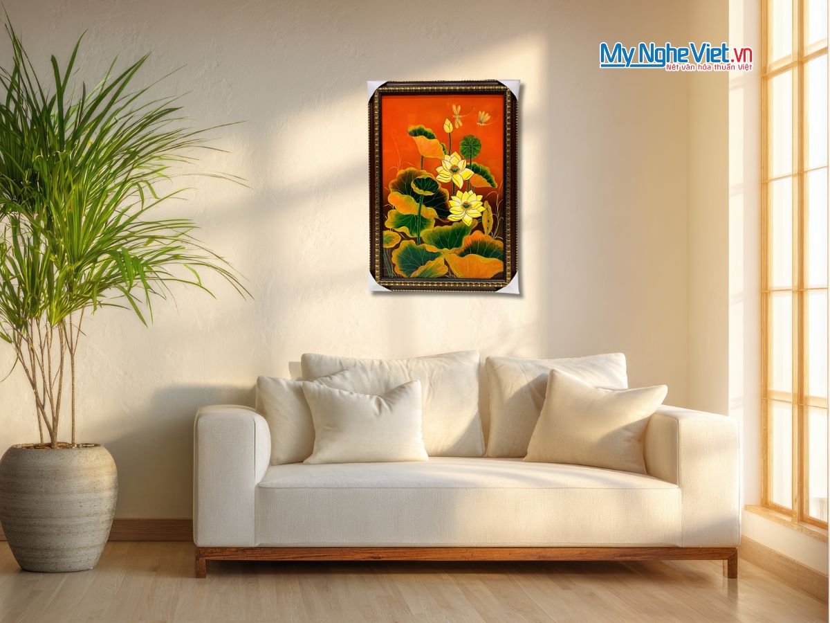 Hoa sen là biểu tượng của sự thanh cao, mang lại may mắn và bình an cho gia chủ. Treo tranh sơn mài sen trong nhà không chỉ làm đẹp không gian mà còn thu hút năng lượng tích cực, giúp tâm hồn thư thái.