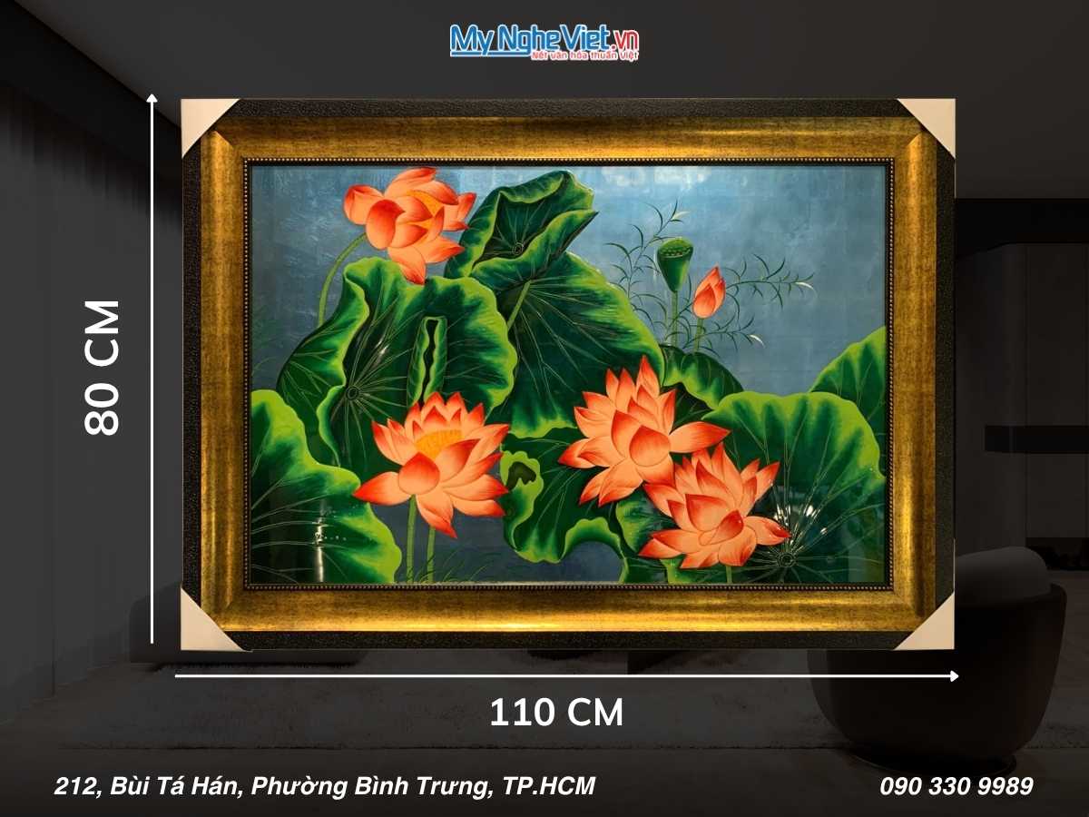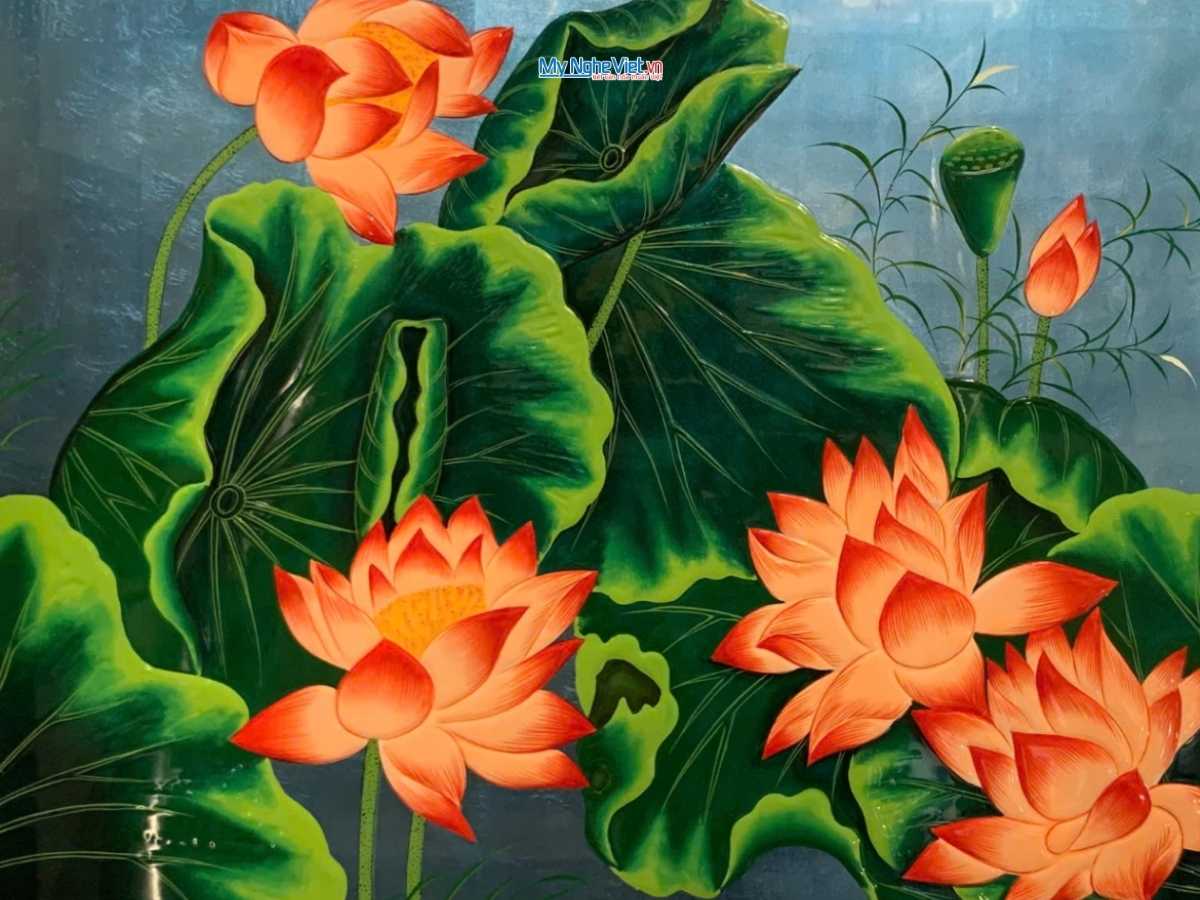 Đặc biệt, tranh sơn mài sen đắp nổi mang đến hình ảnh hoa sen – biểu tượng của sự thanh khiết, kiên cường và thịnh vượng trong văn hóa Việt. Kỹ thuật đắp nổi giúp cánh sen, lá sen hiện lên sống động, chân thực, tạo cảm giác như đang ngắm nhìn một đầm sen rực rỡ ngay trong không gian của bạn.