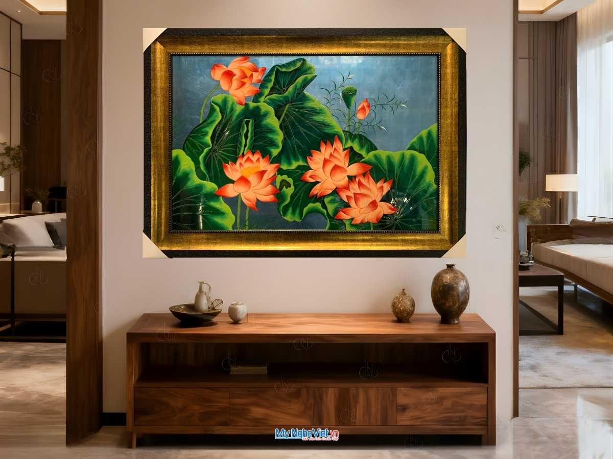 Hoa sen là biểu tượng của sự thanh cao, mang lại may mắn và bình an cho gia chủ. Treo tranh sơn mài sen trong nhà không chỉ làm đẹp không gian mà còn thu hút năng lượng tích cực, giúp tâm hồn thư thái.