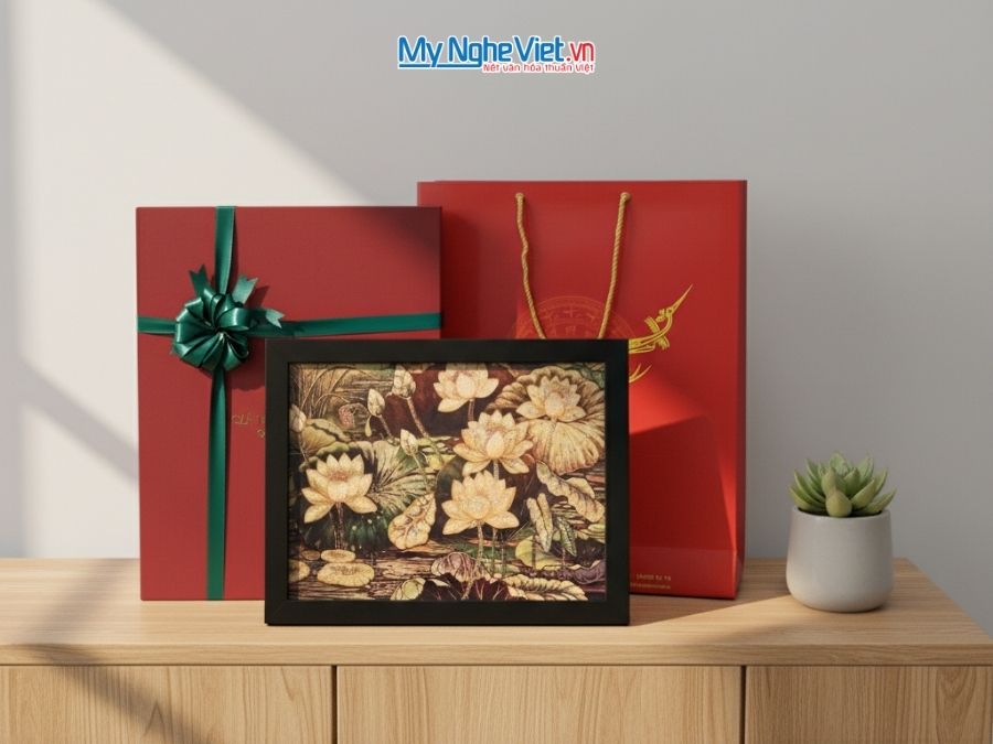 Bộ sản phẩm bao gồm tranh hoa sen và hộp gỗ lót lụa sang trọng.