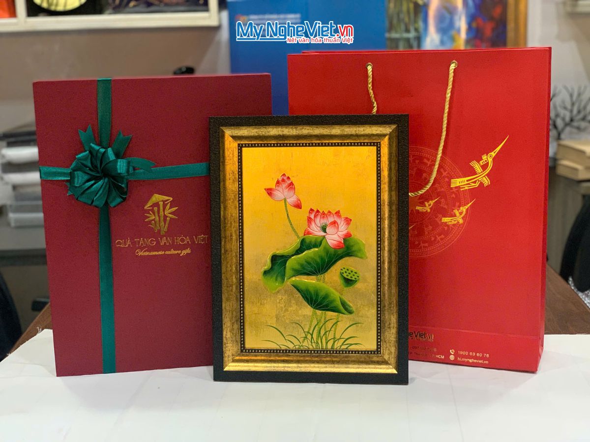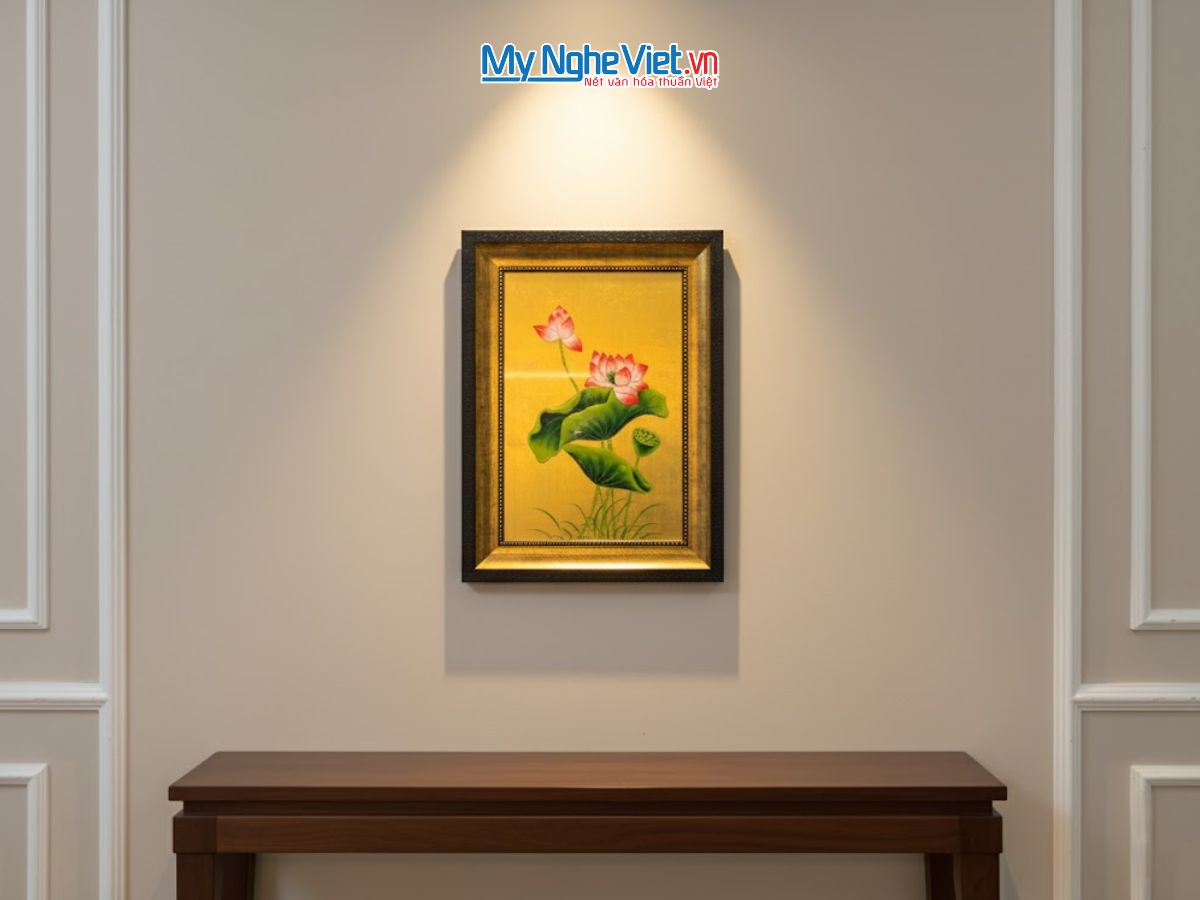 Tranh sơn mài hoa sen dát vàng thể hiện sang trọng và sinh động của loài hoa dân tộc này. Sản phẩm có thể dùng để trang trí, làm quà tặng…..