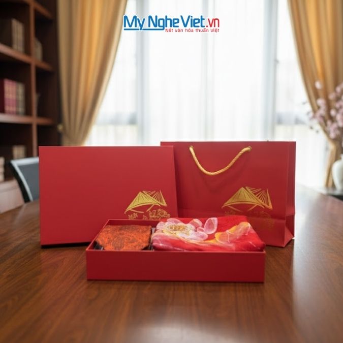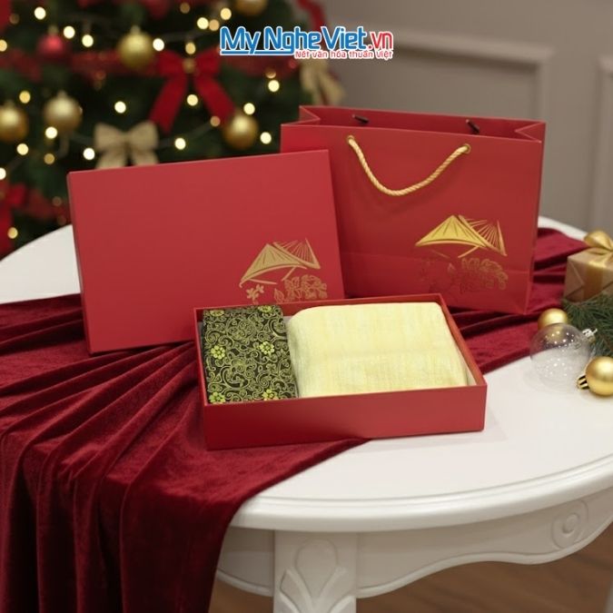 Đến từ làng lụa Hà Đông trứ danh, các sản phẩm khăn và cà vạt được dệt từ tơ tằm tự nhiên bởi các nghệ nhân danh tiếng. Với hoa văn nổi bật, chất liệu mềm mại và cao cấp, đây là món quà thời trang mang đậm nét truyền thống, đặc biệt phù hợp làm quà tặng cho các đại biểu nữ hoặc quà tặng ngoại giao.